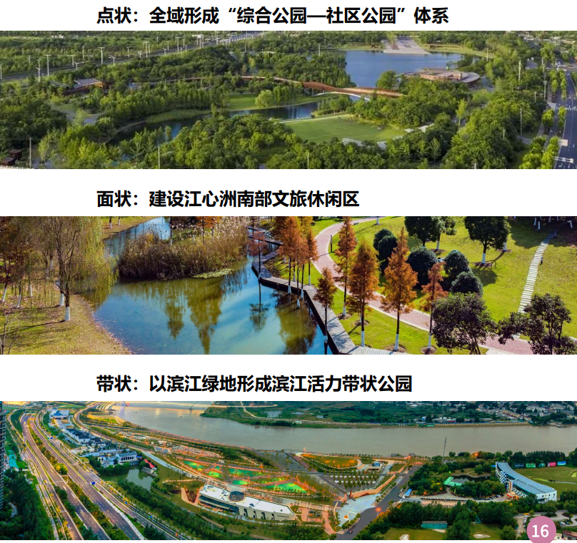 践行“公园城市”建设理念,构建“点—面—带”结合的绿地 与开敞空间系统,全面形成生态良好、功能复合、全民共享的城市公 共空间。