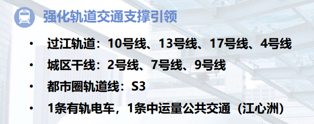 过江轨道(10号线、13号线、17号线、4号线);城区干线(2号线、7号线、9号线);都市圈轨道线(S3线);1条有轨电车、1条中运量公共交通(江心洲)。