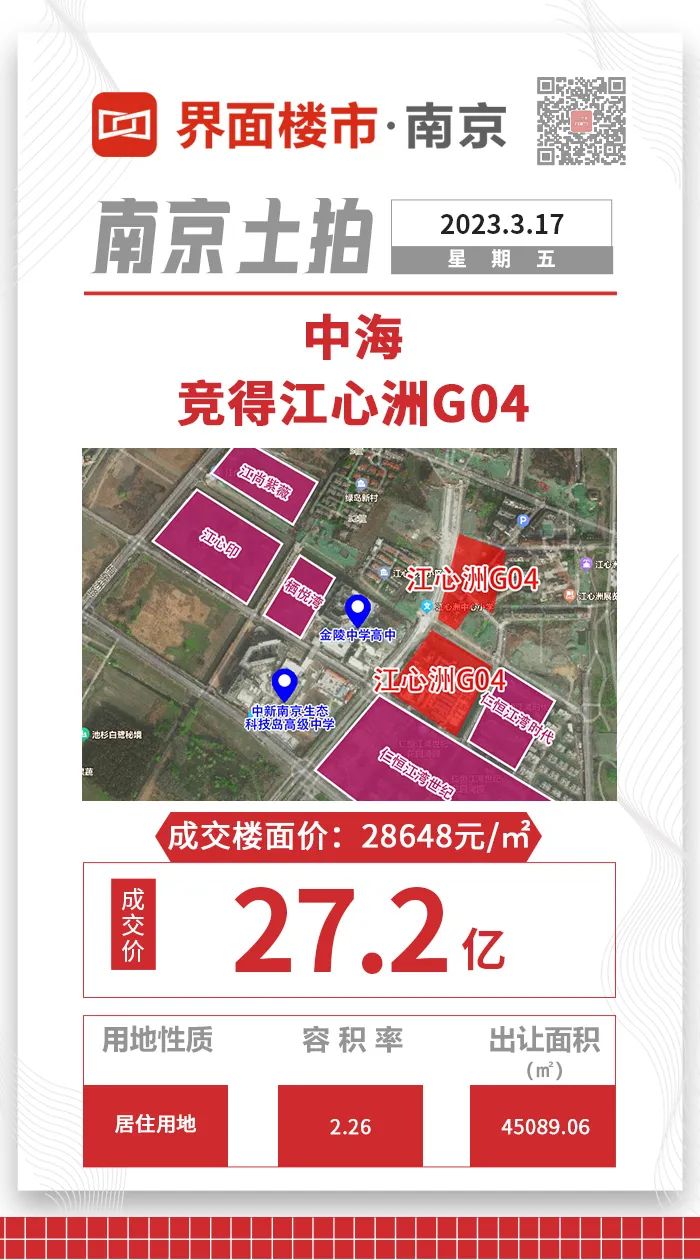 中海江心洲G04地块:今年3月17日,江心洲G04地块,被中海以27.2亿元总价拿下,楼面价28648元/㎡。根据规划,该地块由2个地块组成,用地面积约45089.06㎡,体量非常大,据悉22-007地块可建5栋高层住宅、22-013地块可建10栋高层住宅,打造户型建面约140、158、180㎡,未来总价预计680万起步,最快6月公开。如果按面积140㎡,总价680万来算,未来单价将超过4.8万/㎡。