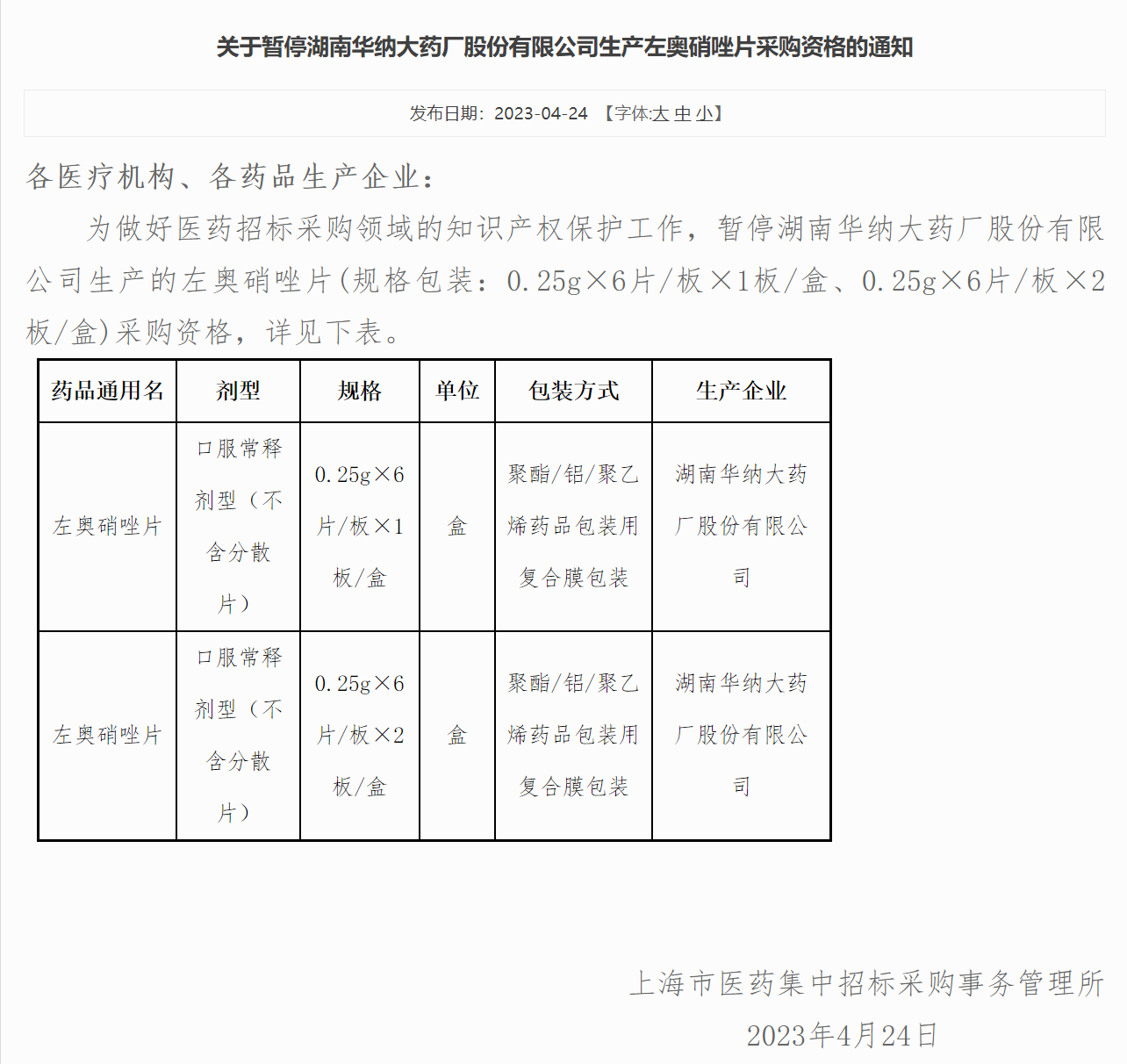 4月24日,上海阳光医药采购网发布一则通知,湖南华纳大药厂股份有限公司(下称华纳药厂)生产的左奥硝唑片两规格(0.25g×6片/板×1板/盒、0.25g×6片/板×2板/盒)被暂停采购资格,撤销理由是“做好知识产权保护工作”。
