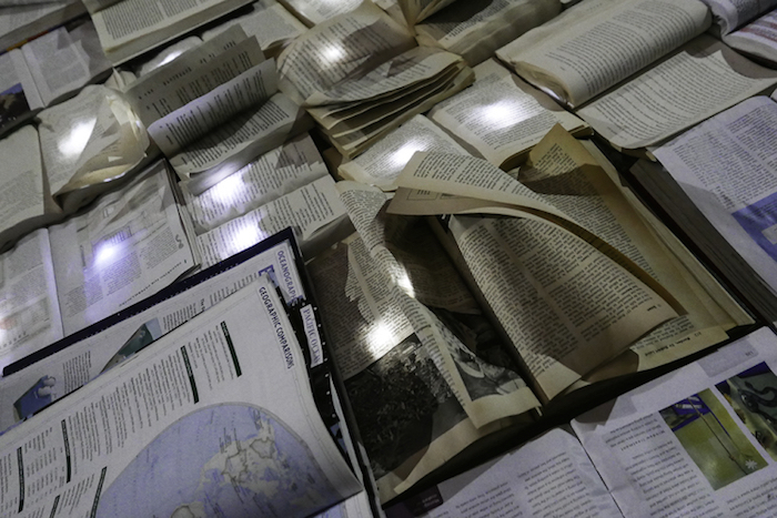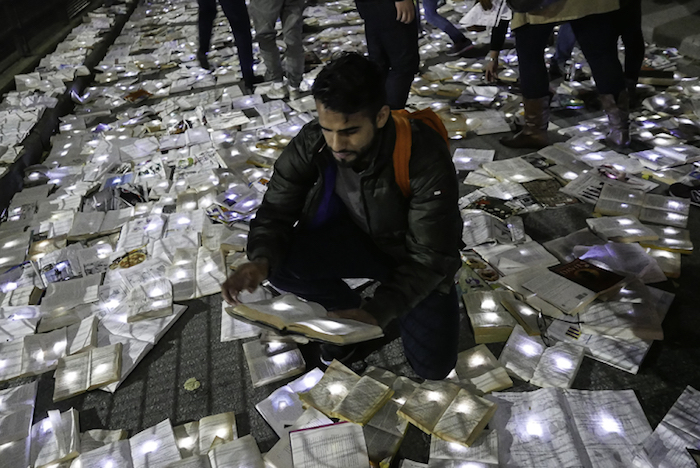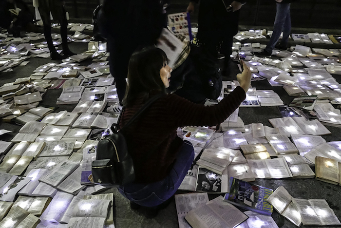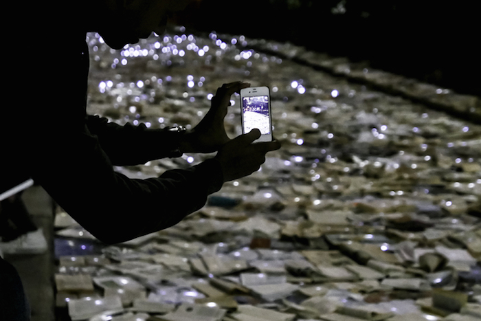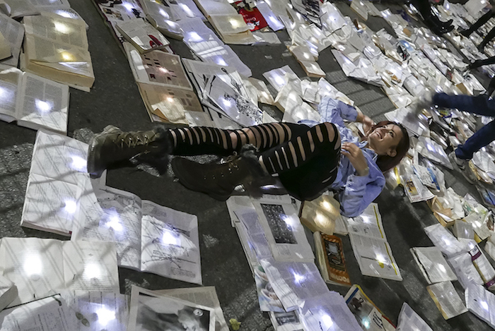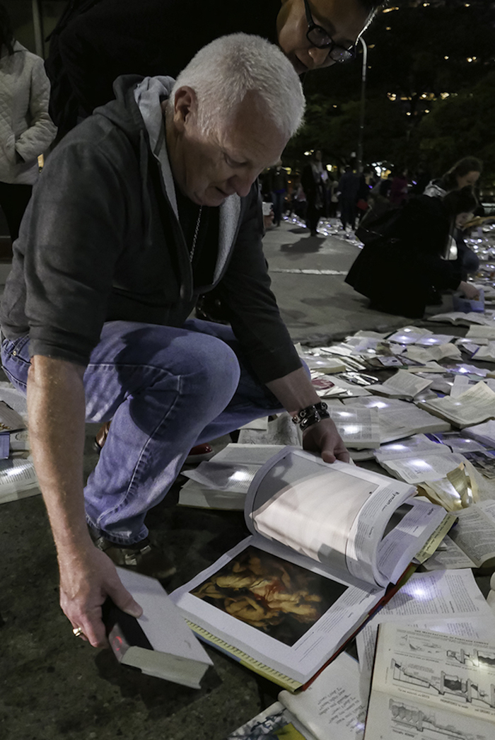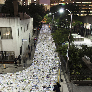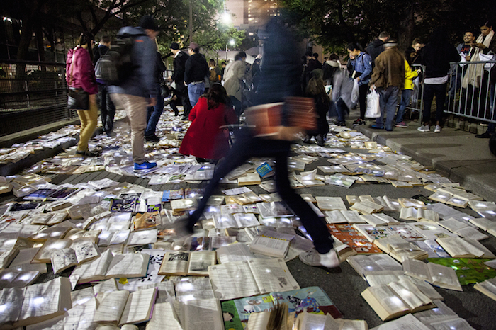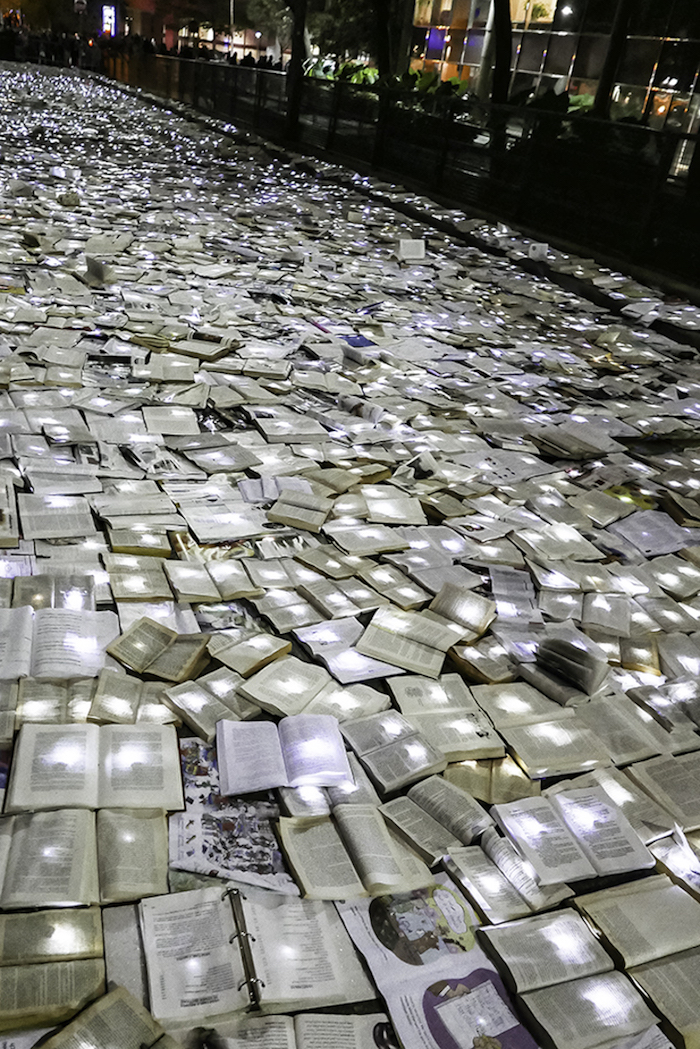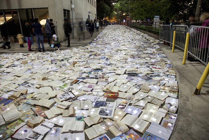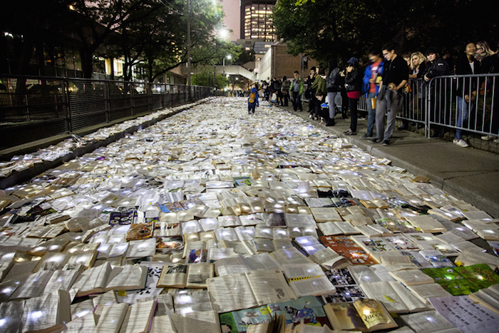 作为多伦多“不眠之夜”活动的一部分,默默无闻的西班牙艺术团队Luzinterruptus将他们的文学书籍代替交通设施的创意推上了舞台,他们封锁了城市中的一条繁忙街道,用一万本书籍取而代之。此前这个活动在马德里,纽约和墨尔本举行过,都是在正常情况下淤滞堵塞、交通拥挤的城市主干道上进行的。街道上流动着书写的文字,没有过往的车辆,这让城市重新获得了更广阔的空间,即使只有一个夜晚而已。他们发人深省的活动通常都是基于环保主义这样经典的主题,每一本书都被一盏小灯照亮,创造出了一条闪闪发光的文学书页之河。