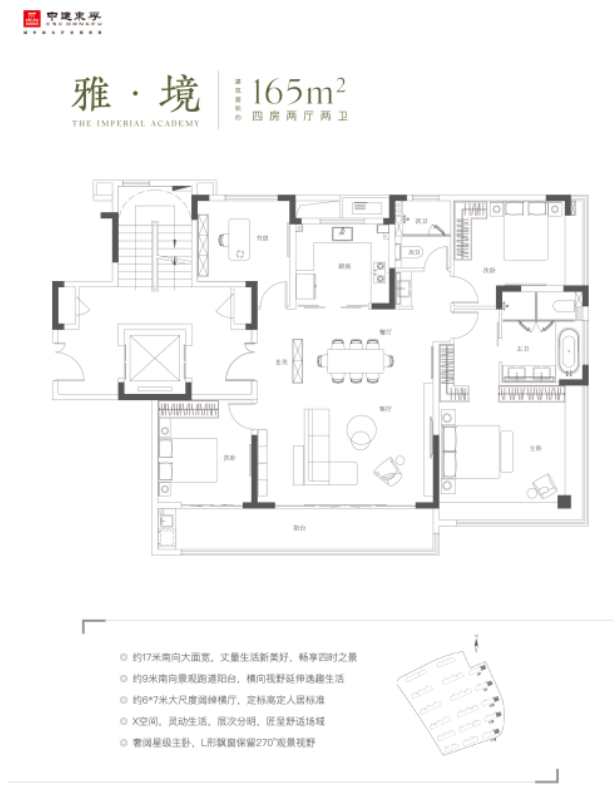 建面约165㎡四房两厅两卫户型:约17米南向大面宽、约9米南向最观的道阳台,约8*7米大尺度阔绰模厅,3+X户型设计,给生活带来了更多的可能性。