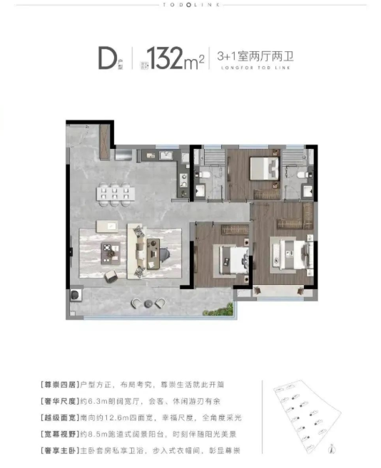 建面约132㎡户型,餐客厅空间使用感通透、LDK一体化设计,配置8.5米大面宽景观阳台。