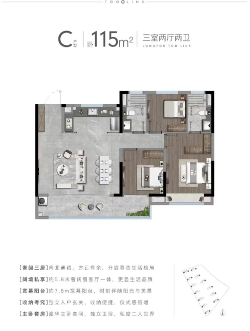 建面约115㎡户型,客餐厅采用宽厅大面宽设计,LDK一体化,客厅配置7.8m大面宽景观阳台,尺度感更强。