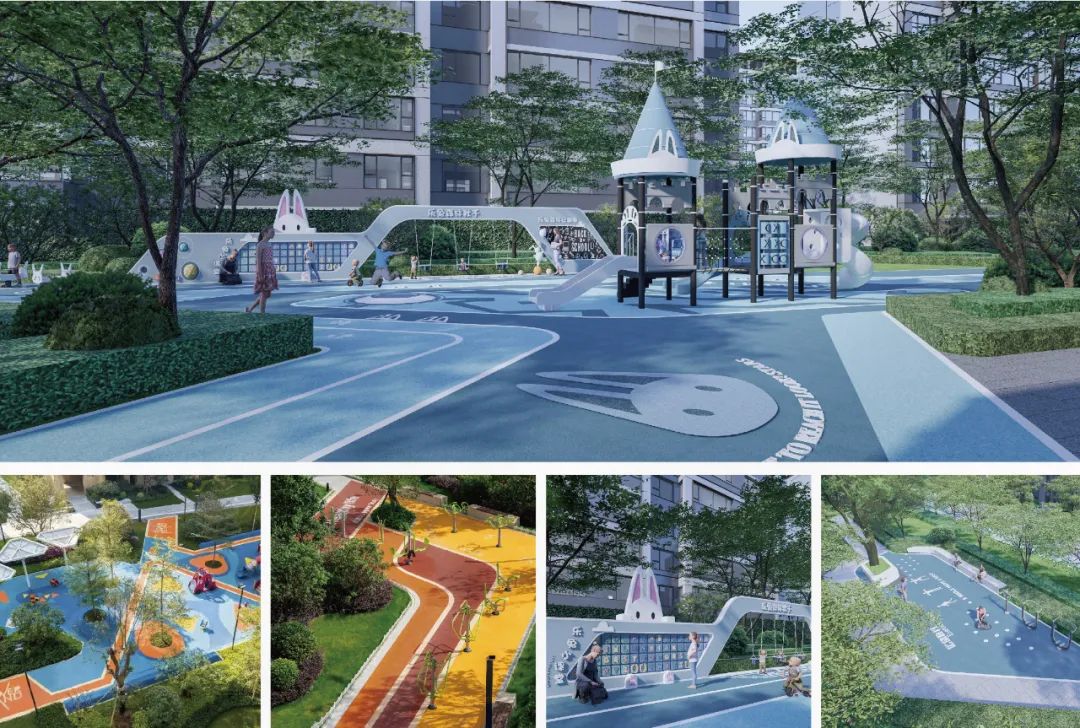 从效果图看,项目的公共区域打造了户外会客厅、林下空间、丛林奇遇、约840米的夜光环氧跑道,景观树有高有低错落有致,外立面采用玻璃幕墙+铝板,整体给人感觉十分舒适。