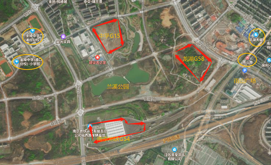 目前,地块内现状为南京地铁10号线城西路停车场,北侧毗邻兰溪公园,南侧为厂房,东西两侧均为空地,临近汉开书院、游府西街小学、浦口高新区人工智能产业园等配套。