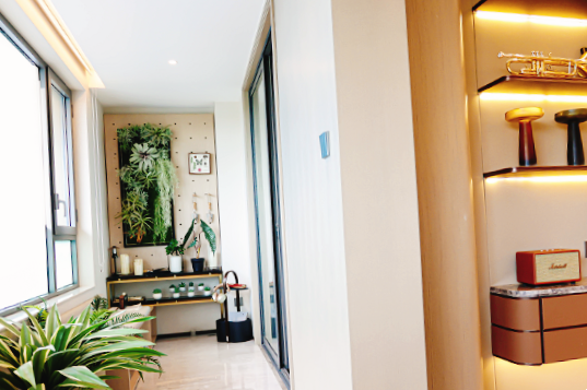 客厅南侧,配置了超大阳台,长约8.5米,采光面非常宽敞,且此处移门为铝合金材质,顶部配置好易点或好太太(升降+照明)晾衣架。