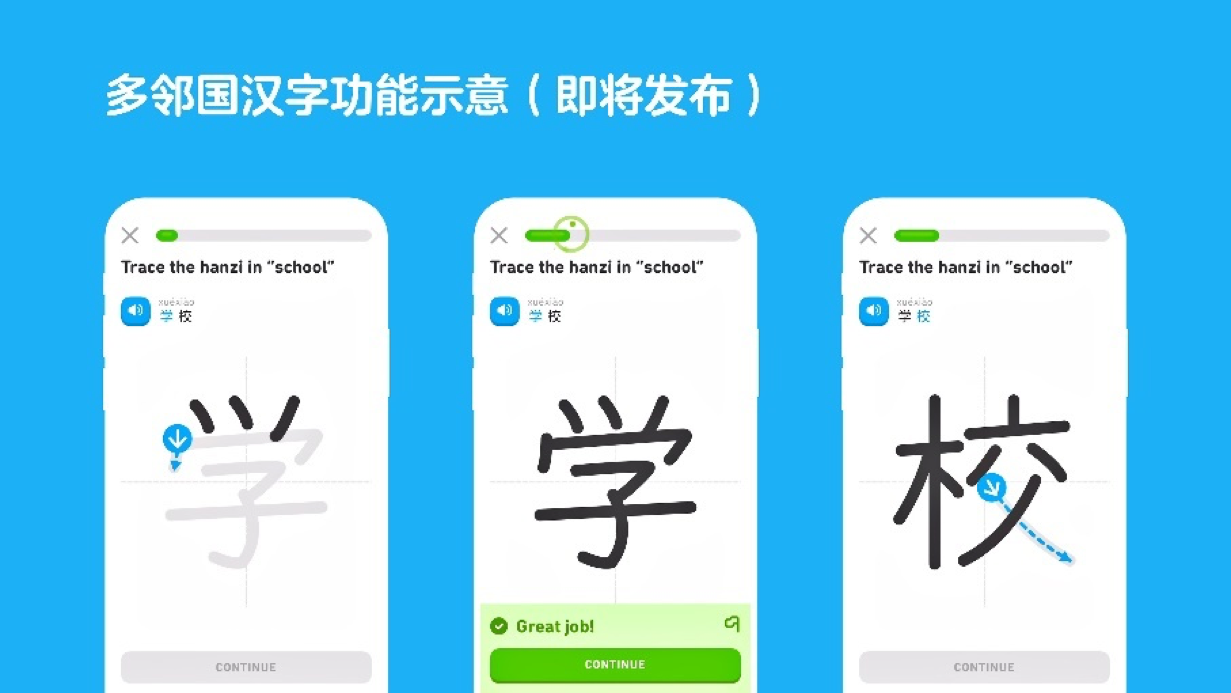 多邻国表示,即将新增的两项功能“汉语拼音学习板块”和“汉字学习板块”,主要锻炼汉语拼音的听力、发音能力和汉字的认读、书写能力。