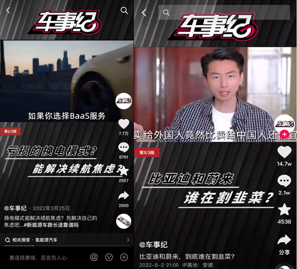 2022年6月2日,名为“车事纪”的抖音账号上传了一系列共三条视频。其中第三条标题为《比亚迪和蔚来,谁在割韭菜?》的视频声称:“蔚来就很有意思了,ES8在国内售价47-63万,出口到了挪威售价是多少?折合人民币41-46万。”视频中将蔚来ES8国内整车(购买电池)售价与在挪威销售的蔚来ES8 BaaS 模式(电池租用服务)价格进行不适当的对比,并刻意忽略挪威对电动汽车免征进口关税和增值税的事实,误导公众产生蔚来区别对待国内外消费者;以及蔚来在挪威卖得便宜,在国内是‘割韭菜’”的印象。该视频最终点赞量超过 33万,蔚来方面认为这条视频对蔚来品牌声誉造成了严重的负面影响。