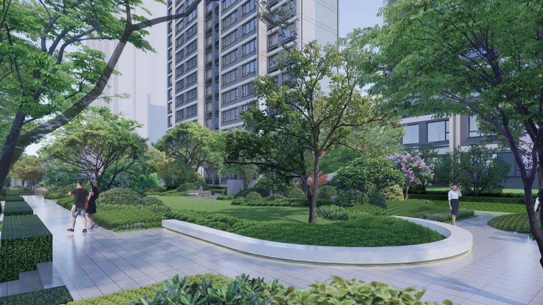 在社区景观上,以“两轴-七境-五感”为轴线,打造约4700㎡中庭景观,链接市政公园 (规划),营造“下楼即公园”的互动体验。