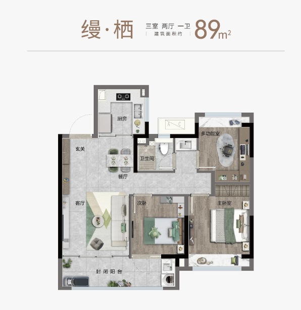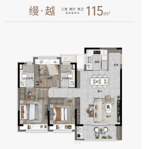 建面约115㎡三室两厅两卫户型在89㎡的入门户型上更进行空间升级。配备独立入户玄关,让回家的第一步充满仪式感。约5米舒厅连通景观阳台,承载一家人的欢乐时光。主卧套间配备独立卫浴、衣帽间,主人私享的静谧空间。贴心双卫设计,无论是三代同堂、或是多孩家庭,皆能轻松满足日常起居需求。