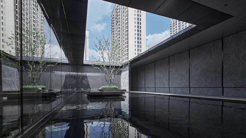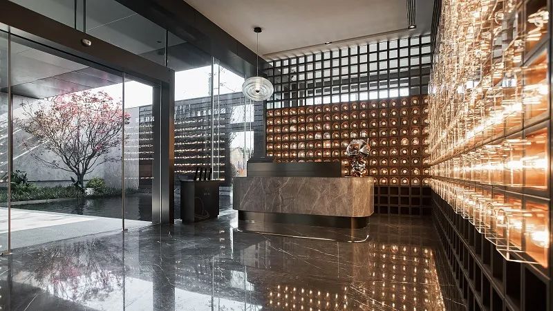 颐和·缦山在入户公区上采用双入户大堂设计,入户单元门为玻璃幕墙,在首层及负一层入户配备电动移门,实属区域难得,未来的业主无论是行车或步行归家,皆是仪式感十足。