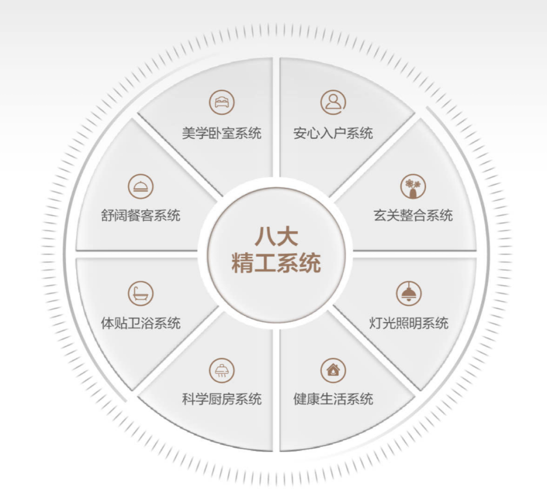 安心入户系统、玄关整合系统、灯光照明系统、健康生活系统、科学厨房系统、体贴卫浴系统、舒阔餐客系统、美学卧室系统,从功能分区到细节呵护,基于客户身心需求的多种场景,精心钻研细节。