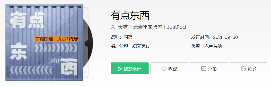 另一方面是品牌甚至开始自己下场做播客了,天猫国际青年实验室就和JustPod联合出品了《有点东西》播客。