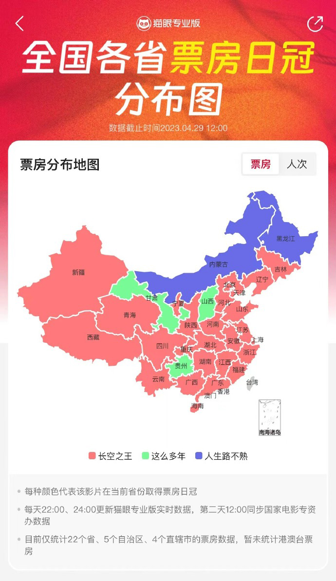 在中国内地其他5个省份中,观众也有不一样的“心头好”。爱情电影《这么多年》是山西、甘肃和贵州省的单日票房冠军;内蒙古和黑龙江的观众则更青睐喜剧电影《人生路不熟》。