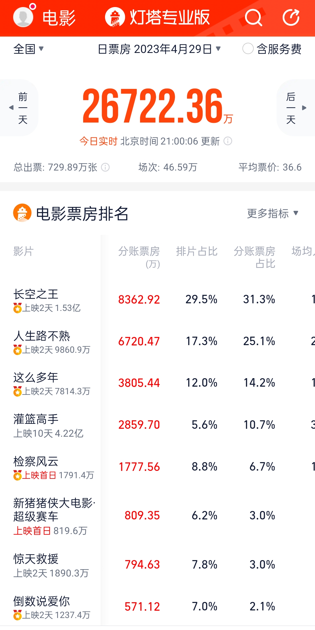 据灯塔专业版,《长空之王》《人生路不熟》《这么多年》形成本档期的第一梯队,获得最多的排片以及最高的票房,但没有一部电影取得单日破亿的成绩。同期上映的其他新片如《新猪猪侠大电影·超级赛车》《惊天救援》《倒数说爱你》更是无法取得单日破千万的成绩。
