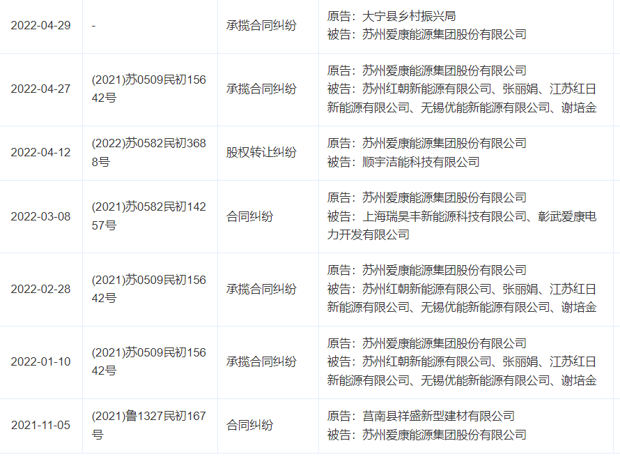 又如,爱康科技为苏州爱康能源集团股份有限公司担保额度达100亿元,该企业成立于2012年,参保人数达95人。其主营业务为开展EPC工程总包,包括大型地面电站、分布式电站、光伏储能系统及光伏农业大棚、渔光互补等工程项目。该企业由多方企业合资而成。如今该企业也深陷多起合同纠纷中。