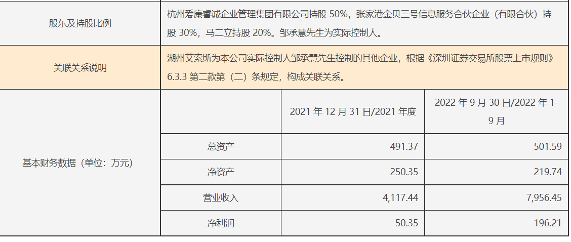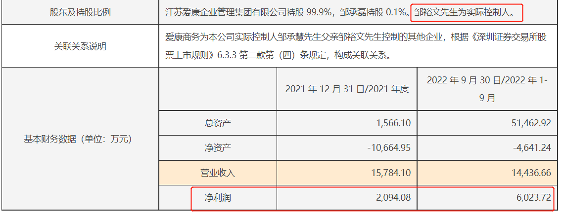 爱康科技和爱康后勤保障发生关联交易,后者的实控人亦是邹承慧,截至2022年9月末,其净利润近90万元,旗下参保人数为10人。