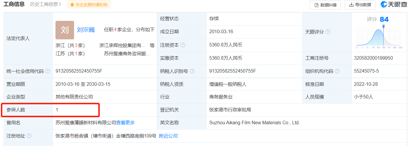 比如,爱康科技为苏州爱康商务咨询服务有限公司担保额度达6000万元,实际担保额3000万元,而该企业由邹承慧及其父亲邹裕文100%持股。该公司成立于2010年,天眼查显示,其实际参保人数仅为1人。