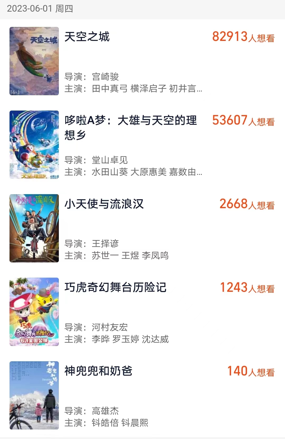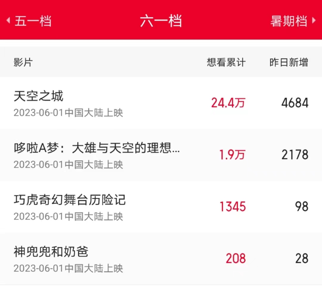 另一部六一档的“旧片”是也将在6月1日上映的《天空之城》。作为宫崎骏和吉卜力工作室推出的首部动画电影,1986年首映的《天空之城》可以说有着更为深厚的情怀加持,猫眼和灯塔双平台的想看人数均超过了另外几部同日上映的动画电影。
