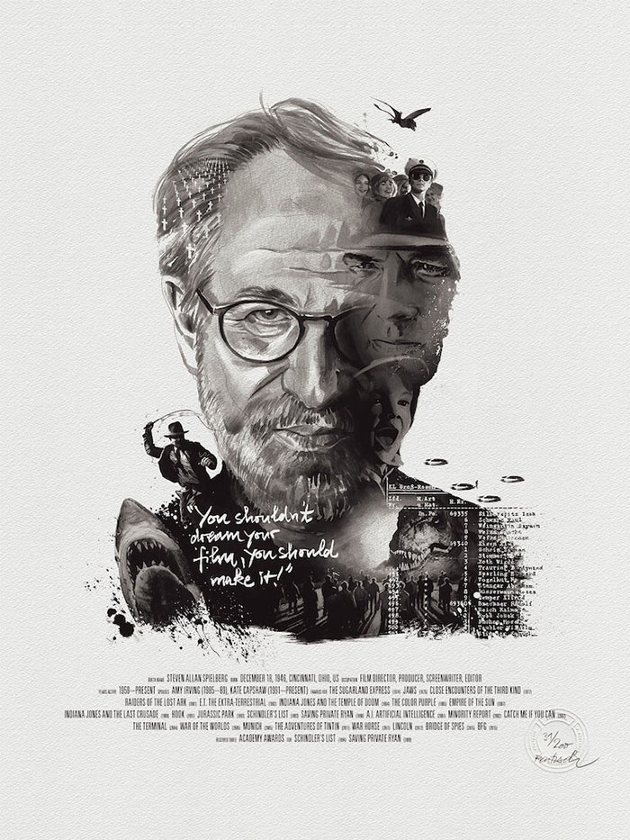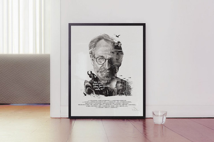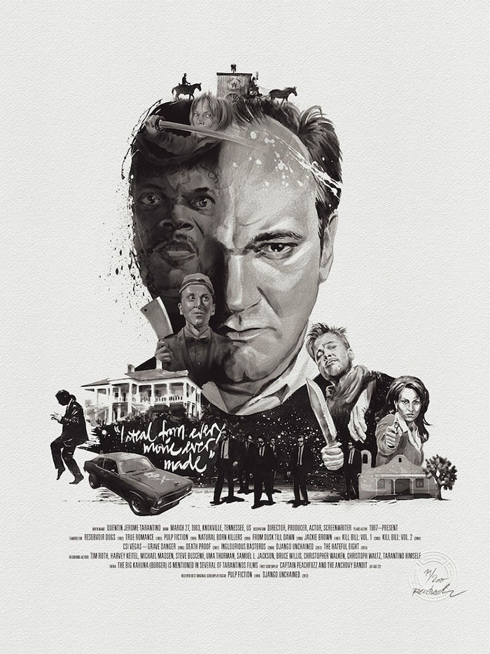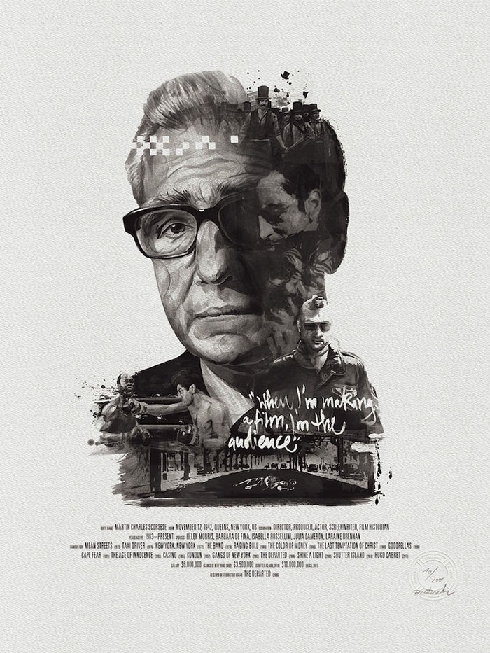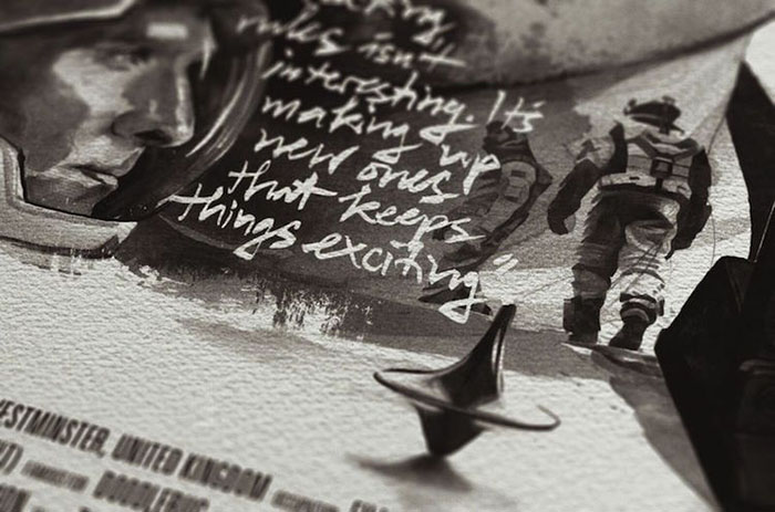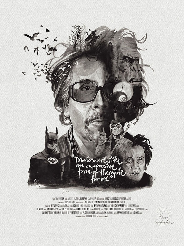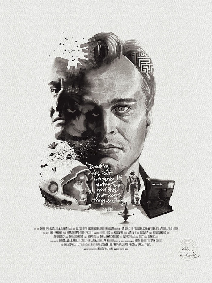 每一位导演的肖像四周还围绕着(甚至是融入了肖像里)由ta本人执导的经典电影中的角色或场景。有一些非常明显,比如你可以在诺兰那张肖像的前景中看到盗梦空间里的那支陀螺,又或是在蒂姆·波顿的镜片里看到《圣诞夜惊魂》中的经典场景。还有一些则比较隐晦,就好比是在看一场电影,你看得越多,就能挖掘出更多信息。最后,Rentzsch还精心挑选了一些该导演的经典台词加入其中,并巧妙地把他们的生平(名字,出生日期以及按时间顺序排列的拍摄电影名称)伪装成了电影海报底部简介的模样。
