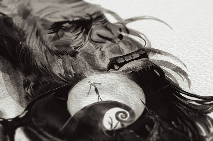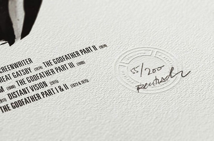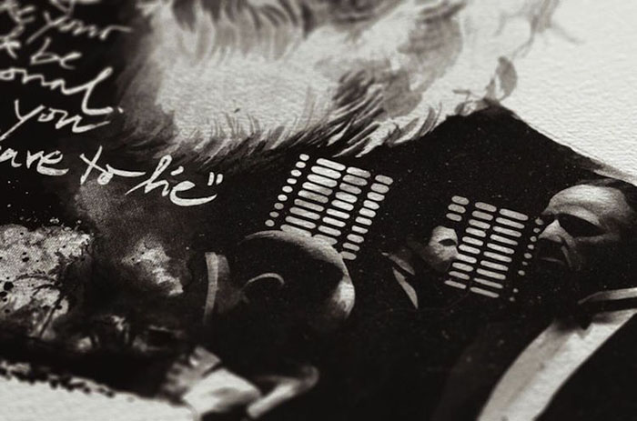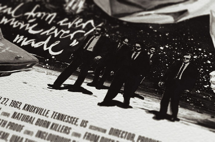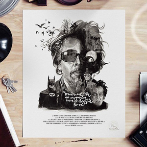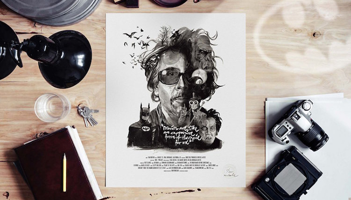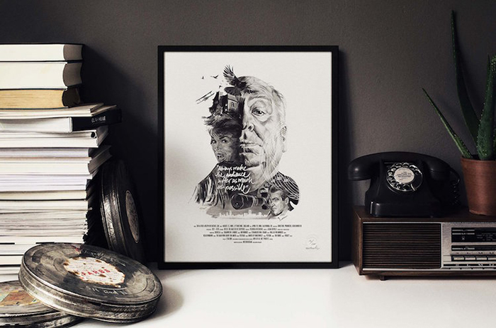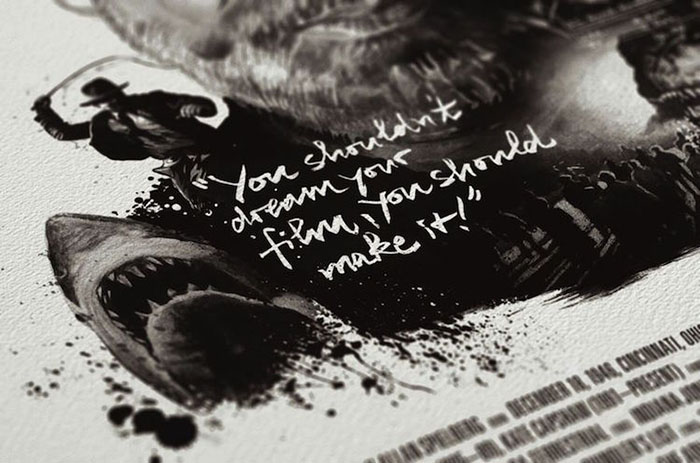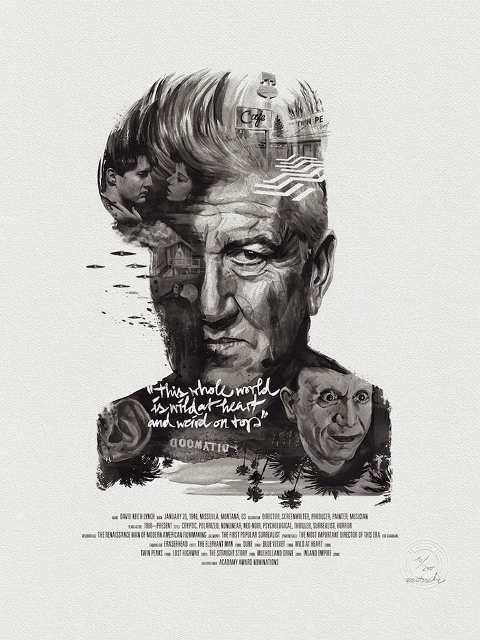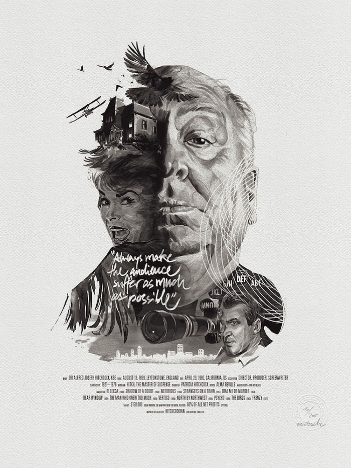 每一位导演的肖像四周还围绕着(甚至是融入了肖像里)由ta本人执导的经典电影中的角色或场景。有一些非常明显,比如你可以在诺兰那张肖像的前景中看到盗梦空间里的那支陀螺,又或是在蒂姆·波顿的镜片里看到《圣诞夜惊魂》中的经典场景。还有一些则比较隐晦,就好比是在看一场电影,你看得越多,就能挖掘出更多信息。最后,Rentzsch还精心挑选了一些该导演的经典台词加入其中,并巧妙地把他们的生平(名字,出生日期以及按时间顺序排列的拍摄电影名称)伪装成了电影海报底部简介的模样。
