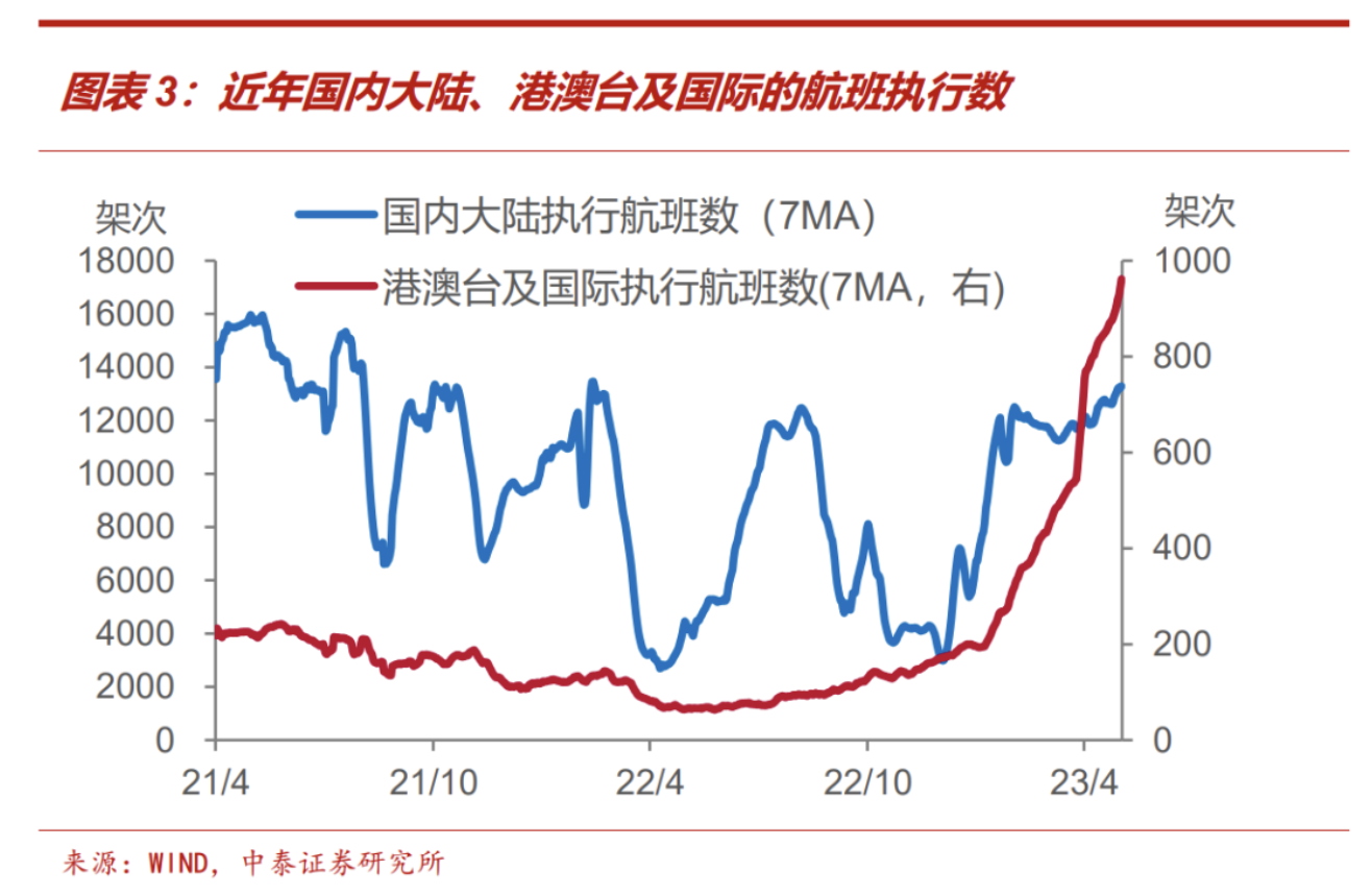 五一假期国内大陆执行航班数超过2019年同期,港澳台及国际执行航班数创疫后新高。航班管家数据显示,今年五一假期前4天,国内大陆航班累计执行5.36万架次,同比增长278.0%,较2019年同期增长14.6%,和交通运输部公布的民航旅客发送量超过2019年同期相互印证;港澳台及国际航班执行4035架次,同比增长632.1%,创疫后新高,但和2019年同期相比仍下降了61.7%。