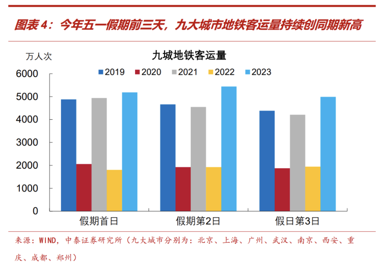 今年五一假期前三天,九大城市地铁客运量均处于历史同期新高。4月29日至5月1日,九大城市地铁客运量共计1.56亿人次,较2019年和2021年五一假期前三天的地铁客运量,分别增长12.2%和14.0%。疫情影响消退后,居民出行意愿恢复正常,假日旅游需求旺盛进一步推动地铁客运量创历史同期新高。