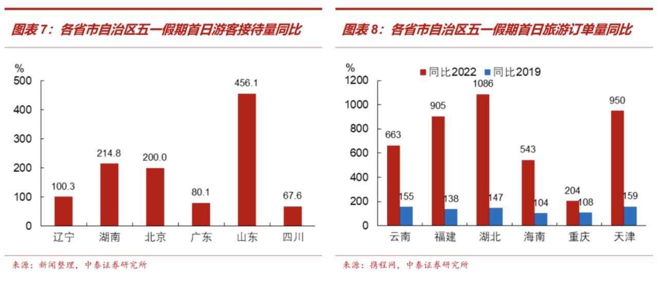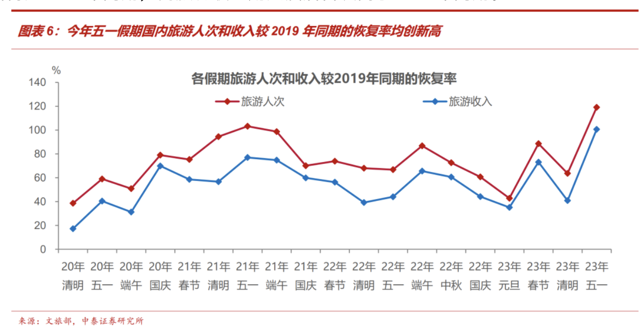 和2019年同期相比,今年五一假期国内旅游人次和收入的恢复率均创疫后新高。根据文化和旅游部数据中心的测算,2023年五一假期全国国内旅游出游2.74亿人次,同比增长70.8%,按可比口径恢复至2019年同期的119.09%;实现国内旅游收入1480.56亿元,同比增长128.90%,按可比口径恢复至2019年同期的100.66%。对比疫后主要节假日旅游较2019年同期的恢复率,可发现今年五一假期旅游人次和收入的恢复率均是最高的,旅游人次继2021年五一后再超2019年同期,而旅游收入则是疫后首次高于2019年同期。