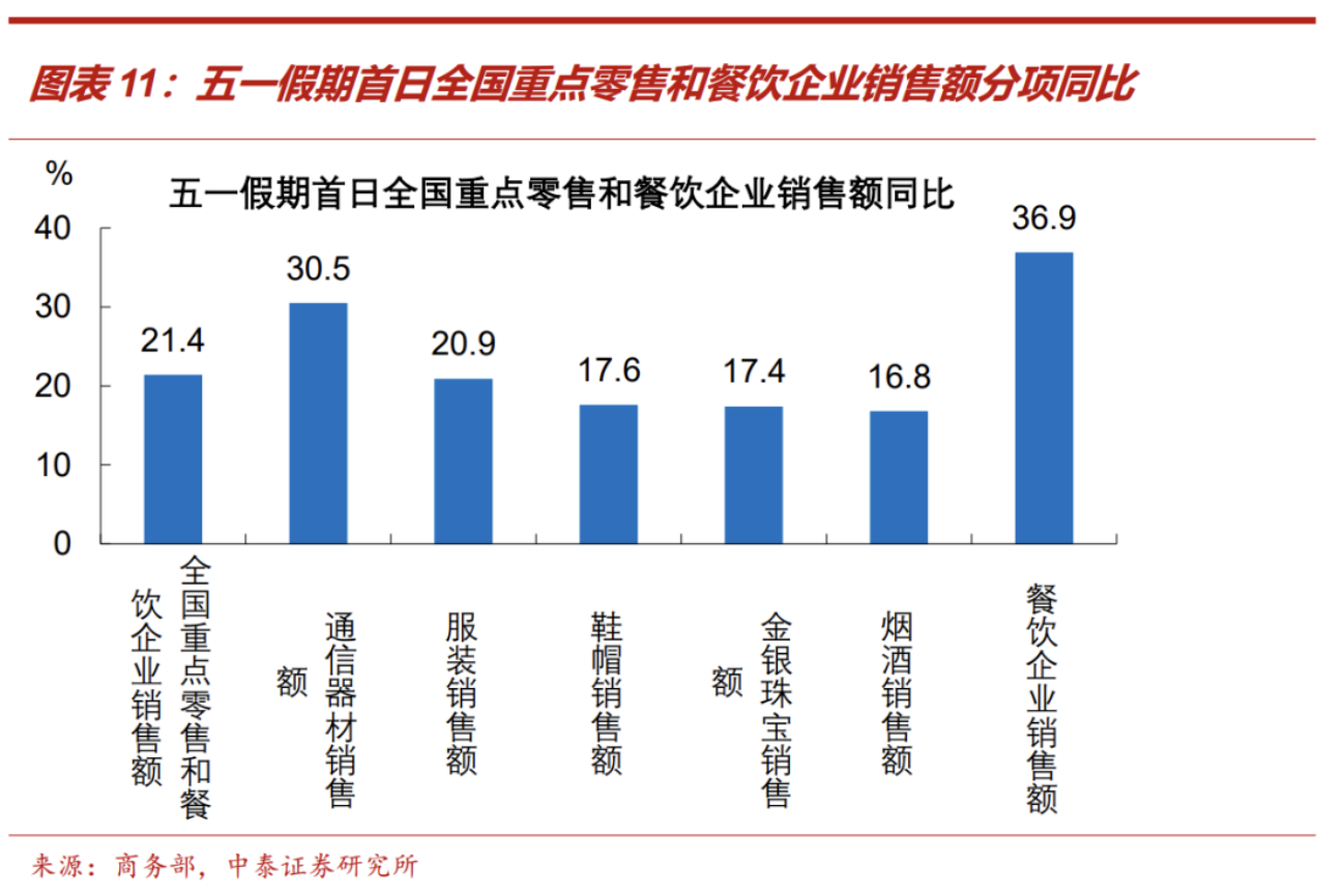 零售餐饮继续向好。据商务部监测,今年五一假期首日,全国重点零售和餐饮企业销售额同比增长21.4%,其中通信器材、服装、鞋帽、金银珠宝、烟酒的销售额,分别同比增长30.5%、20.9%、17.6%、17.4%和16.8%。餐饮休闲类消费大幅攀升,今年五一假期首日全国重点餐饮企业销售额同比增长36.9%,明显快于商品零售的增速。正如我们在《非对称复苏的印证》中提到的,相比于制造业,疫情对服务业消费场景的冲击更大,因此疫后服务业恢复的弹性也更大。