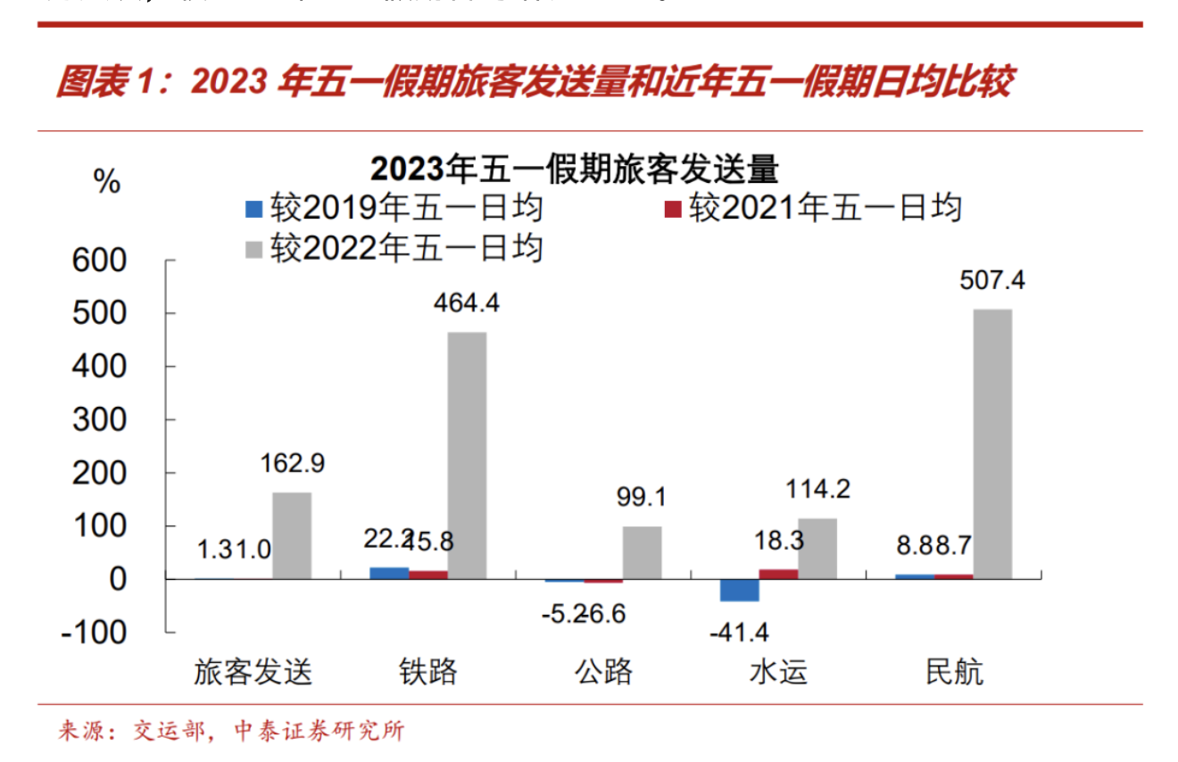 分出行方式看,2023年五一假期铁路预计日均发送旅客1817.6万人次,较2019年五一假期日均增长22.2%;公路预计日均发送旅客3261.8万人次,较2019年五一假期日均下降5.2%;水运预计日均发送旅客136.1万人次,较2019年五一假期日均下降41.4%;民航预计日均发送旅客188.3万人次,较2019年五一假期日均增长8.8%。