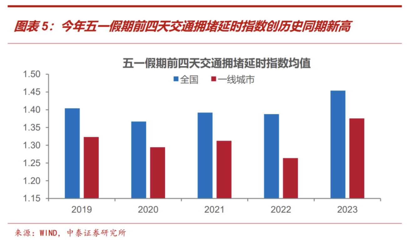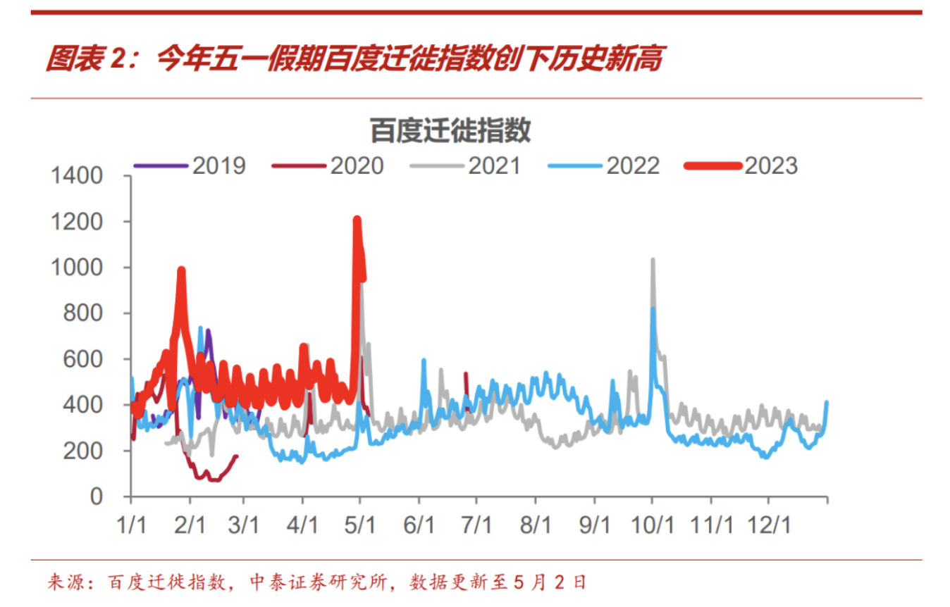 百度迁徙指数,可以作为衡量人口的跨地区流动,今年五一假期其创下历史新高。4月29日百度迁徙指数为1210.3,是迄今为止的历史最高值,较2021年国庆假期和今年春节的峰值(分别为历史第二高和第三高),分别高16.9%、22.4%,显示今年五一假期人员流动规模空前。今年五一假期前四天,百度迁徙指数均值较2021年同期增长51.3%,较2022年同期增长219.6%。假期前四天,持续处于全国迁入地前10的城市有广州、成都、北京、深圳、杭州和上海,显示相关城市对旅客的吸引力较强。