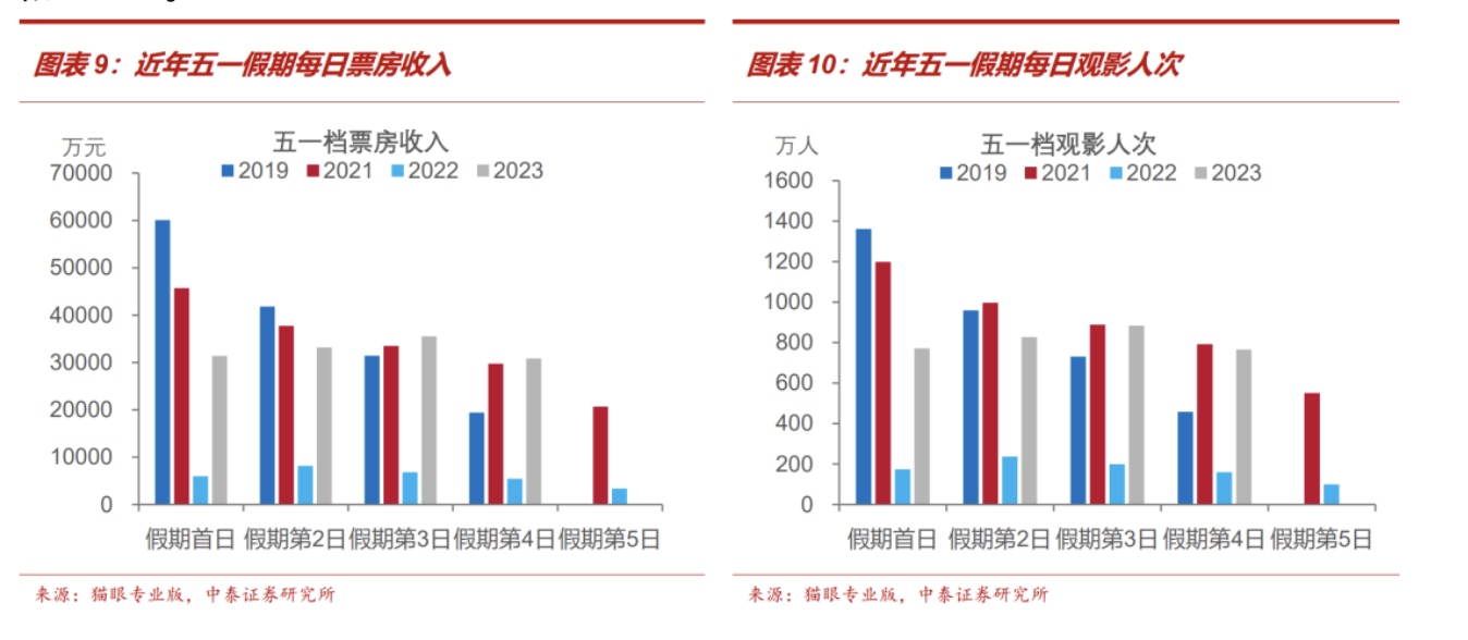 今年五一档电影新片明显增加,但票房收入不及2019年和2021年同期。今年五一档定档新片19部,是历年五一档最多的一次。影院营业数持续破1.1万家,远好于去年同期水平(约8000家)。但电影票房收入难言亮眼,据猫眼专业版统计,今年五一假期前4天,全国电影票房累计收入13.1亿元,累计观影3248万人次,虽明显好于2022年同期,但和2019年和2021年同期相比仍有差距。票房收入分别恢复到2019年和2021年同期的85.8%、89.3%,观影人次分别恢复到这两年的92.5%和83.8%。电影票房恢复较慢,可能和外出旅游人数大幅增加后,观影需求下降有关。