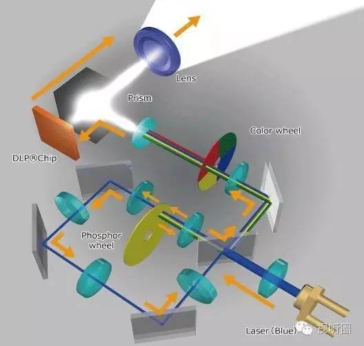 为什么厂商要推出双色激光呢?在没有双色激光出现之前,大致有激光荧光色轮、激光滚筒色轮、三原色激光、激光LED混合光源,其中蓝色激光+荧光色轮应用较为普遍,主要因其有效的解决了成本问题,也绕过了绿色激光器的研发难度,但是却牺牲了激光的“纯纯的味道”——因为,经过荧光色轮之后,实际参与成像的不是激光,而是荧光。