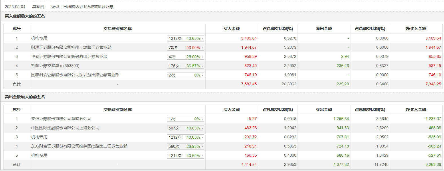 具体来看,机构买入3502.91万元,卖出1455.97万元,合计净买入2046.94万元。此外,财通证券杭州上塘路证券营业部、华泰证券绍兴府山证券营业部分别买入1944.67万元、958.59万元;安信证券海南分公司、中国国际金融上海分公司分别卖出1256.34万元、941.33万元。