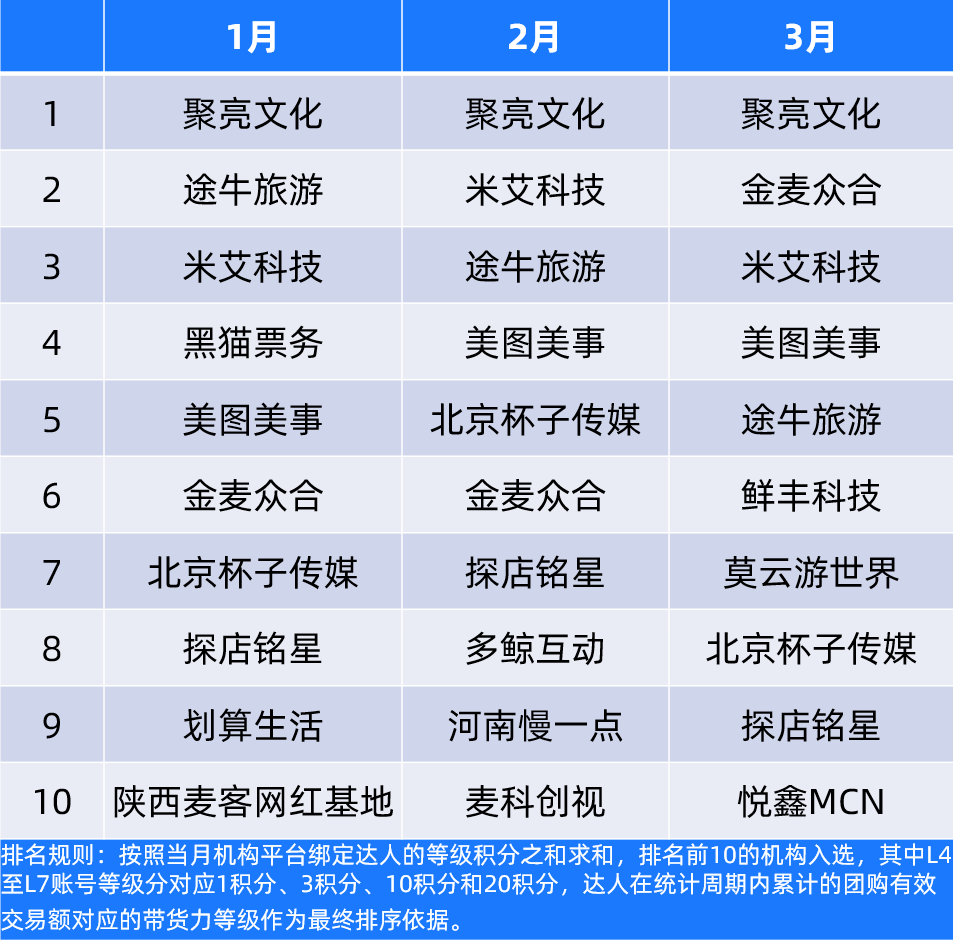 该榜单是平台按当月机构绑定达人的等级积分之和求和,筛选进入前10的机构(L4至L7账号等级分对应1积分、3积分、10积分和20积分),然后再根据达人在统计周期内累计的团购有效交易额对应的带货力等级,作出最终排序。