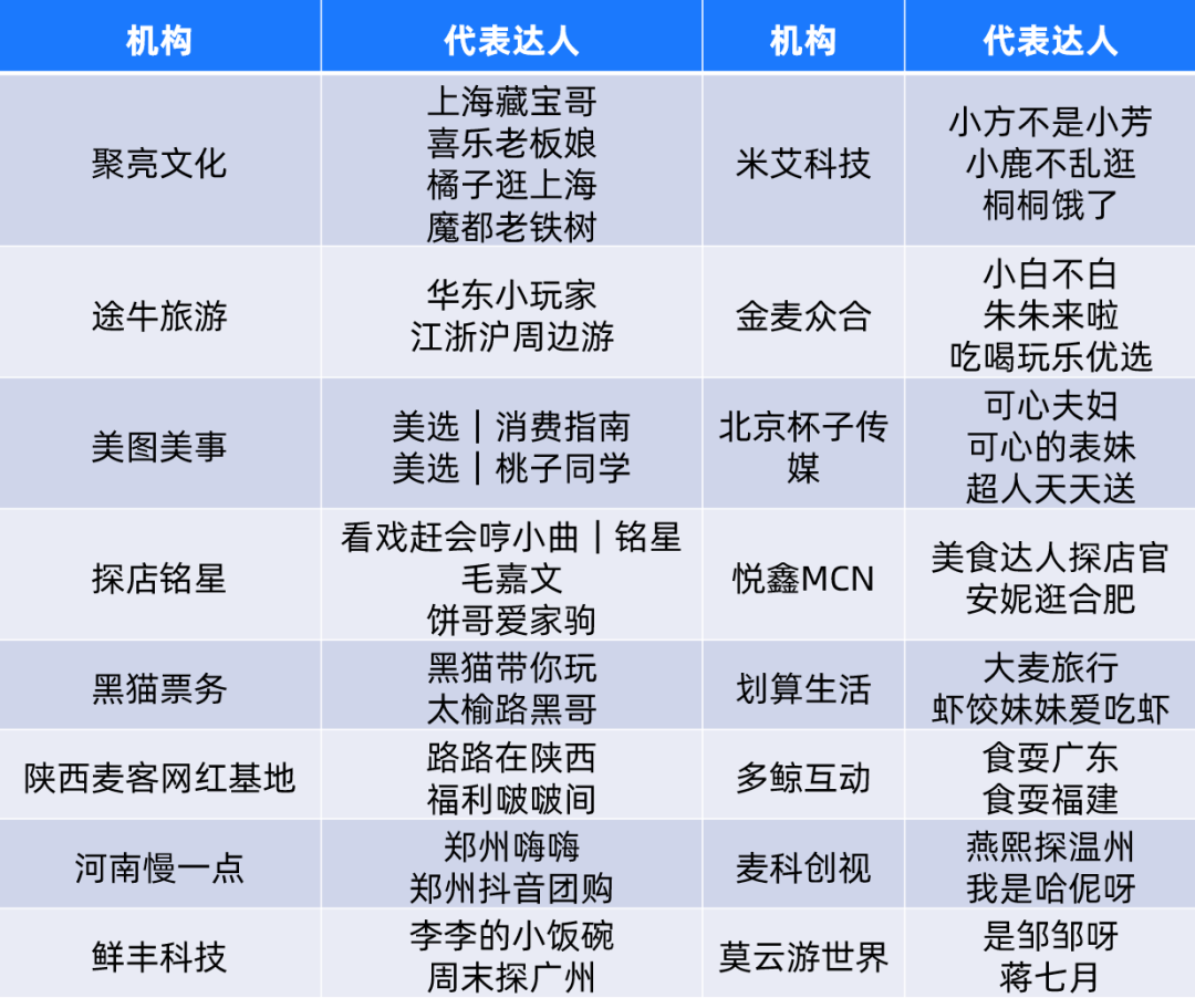 此前,抖音发布了今年第一季度的“机构月度排行榜”,16家机构成功登榜,旗下代表达人有38位。其中,聚亮文化连续3个月保持TOP1,旗下代表达人有“上海藏宝哥”、“喜乐老板娘”、“橘子逛上海”、“魔都老铁树”;途牛旅游、米艾科技、美图美事、金麦众合、北京杯子传媒、探店铭星连续上榜3个月,排名靠前。