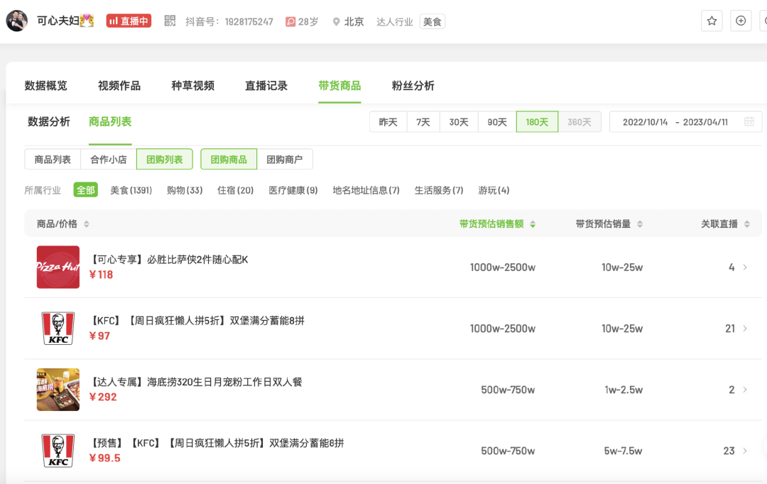 飞瓜数据显示,近30天内,“可心夫妇”共开播57场直播,销售额、销量和场观最高的直播间是3月21日的海底捞生日嘉年华,预估销售额为500万-750万元。近180天内,可心夫妇带货预估额最高的单品是“必胜客比萨2件随心选”,预计成交额超过1000万元。