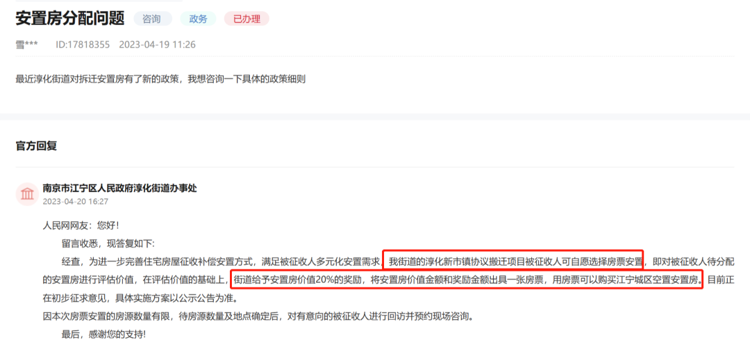 近期,江宁淳化宣布,即将推出房票安置新政:给予20%的安置房价值奖励,用于购买江宁城区空置安置房。对此,江宁人民政府给出证明回复:确有其事!