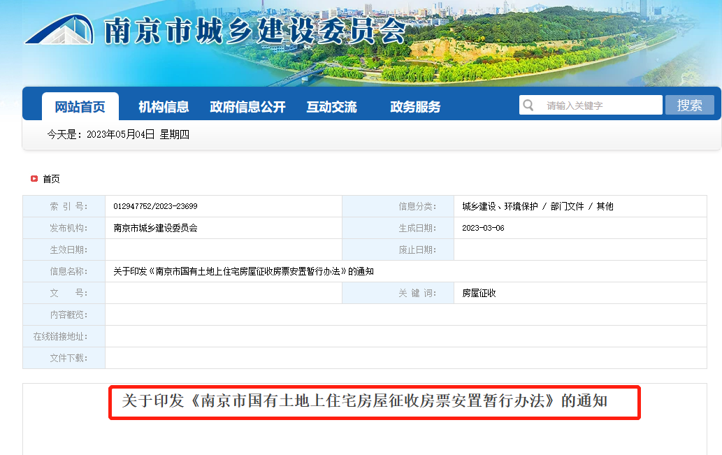 2023年3月,《南京市国有土地上住宅房屋征收房票安置暂行办法》正式实施,明确了主城六区国有土地上房屋征收项目适用房票安置。