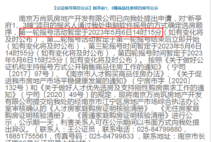 今日,据南京公证处显示,位于江宁东山的纯新盘——朗诗玲珑新亭项目将于2023年5月6日14时15分开始第一轮摇号活动。