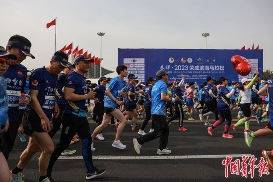4月30日早上7点30分,山东荣成,2023荣成滨海马拉松赛鸣枪起跑,国内外的1.2万余名跑友在“最美赛道”上尽情奔跑。荣成滨海马拉松比赛曾因疫情停办3年,今年重新回归。中青报·中青网记者 曲俊燕/摄