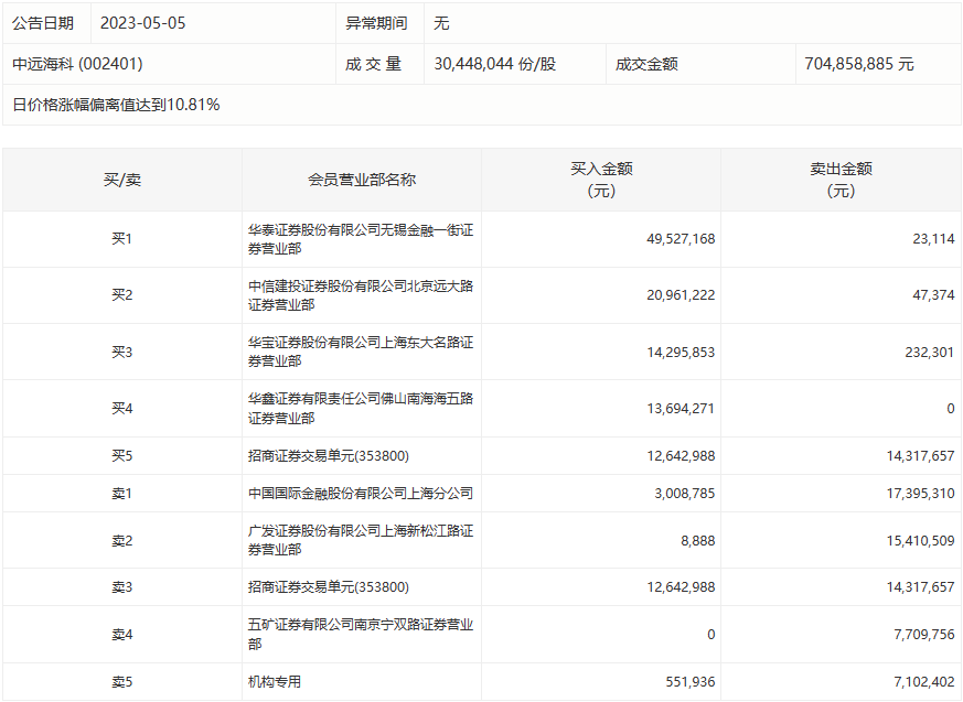 5月5日,中远海科今日涨停,龙虎榜数据显示,上榜营业部席位全天成交1.77亿元,占当日总成交金额比例为25.1%。其中,买入金额为1.15亿元,卖出金额为6223.84万元,合计净买入5245.27万元。