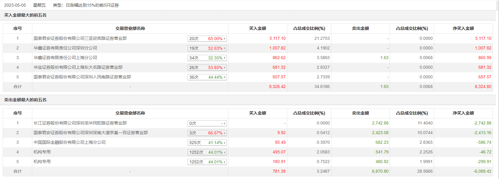 5月5日,新城市今日涨停,龙虎榜数据显示,上榜营业部席位全天成交1.6亿元,占当日总成交金额比例为66.44%。其中,买入金额为9107.81万元,卖出金额为6872.43万元,合计净买入2235.38万元。