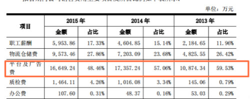 (图为茵曼2013~2015年的广告费用情况,2015年整体费用及费用率都有所下降。根据其官方解释,2015年公司为提高广告回报率,采用了预算控制、使用了商务智能系统,成效显著;此外,公司在唯品会的销售收入占比上升,唯品会广告费用率低于天猫等其他主要平台)