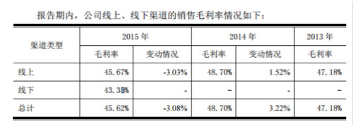 (图:茵曼招股书中显示,2015年线下渠道的销售毛利为43.35%,比线上毛利率45.67%稍低)