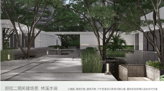 景观上,用树、绿篱、草坪等自然元素,把空间围合出尺度感,呈现质感的高雅,归家动线上透过植物的穿插、叠水的构景来模拟自然借此打造了林溪水岸,伴随漫水汀步走在其中就像走在山间泉边。