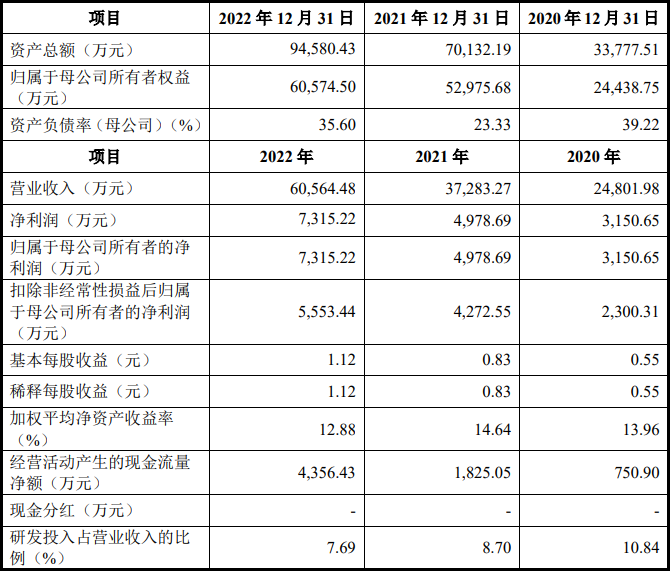 招股书显示,公司是一家以光电子技术研发与应用为核心,为新一代激光应用系统提供解决方案的高新技术企业,形成激光雷达业务、工业激光业务、光通讯业务、生物医疗及其他业务四大业务板块。2020年、2021年、2022年公司营业收入分别为2.48亿元、3.73亿元、6.06亿元,同期实现归属于母公司所有者的净利润为3150.65万元,4978.69万元,7315.22万元。