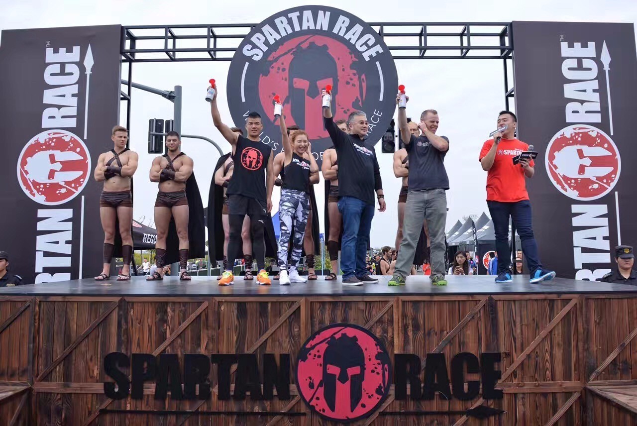 ▼上海站发令嘉宾,左起:知名极限马拉松运动员陈盆滨、台湾著名艺人徐洁儿、盛力世家CEO李胜、斯巴达勇士赛创始人乔·德·塞纳