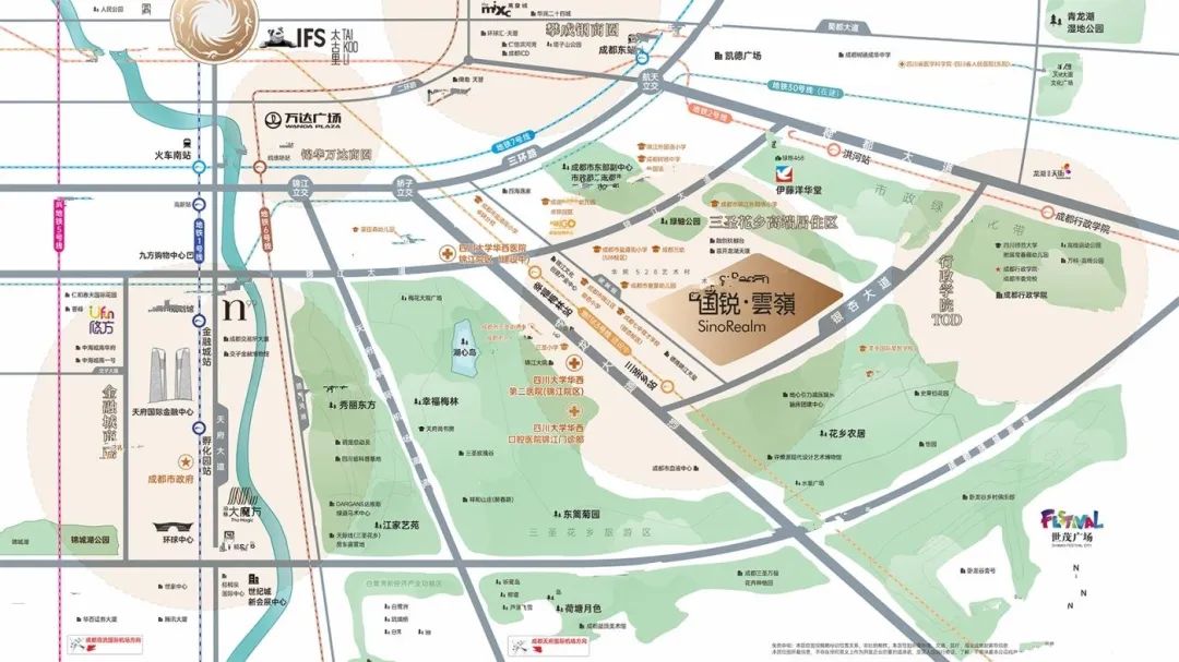 国锐取得的地块位于成龙大道北侧,为三圣乡开发较早的成熟区,周边有首开龙湖天璞、融创玖樾台等多个成熟的小区,居住氛围浓厚。附近还有锦江区银杏小学、成都七中育才学校、四川大学华西第二医院等配套。